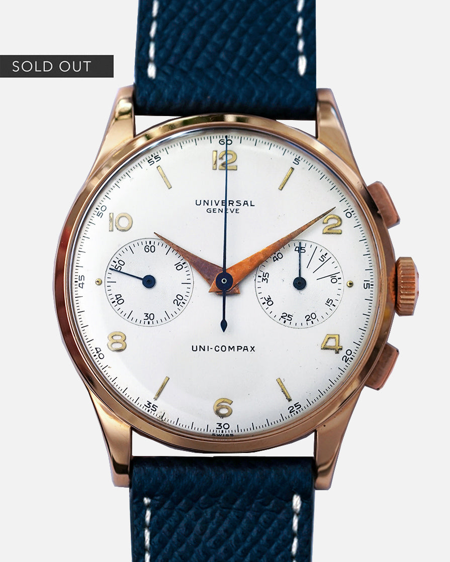 At The Time Curator, we specialize in collectible timepieces with a sharp eye for rarity and condition. This Uni-Compax in a jumbo 37.5mm rose gold is a perfect example of the latter, a remarkably preserved gem. Nearly mint and razor-sharp, it stands among the finest we've handled from the brand in years. Its clean state is all the more impressive considering it's pushing 75 years old.