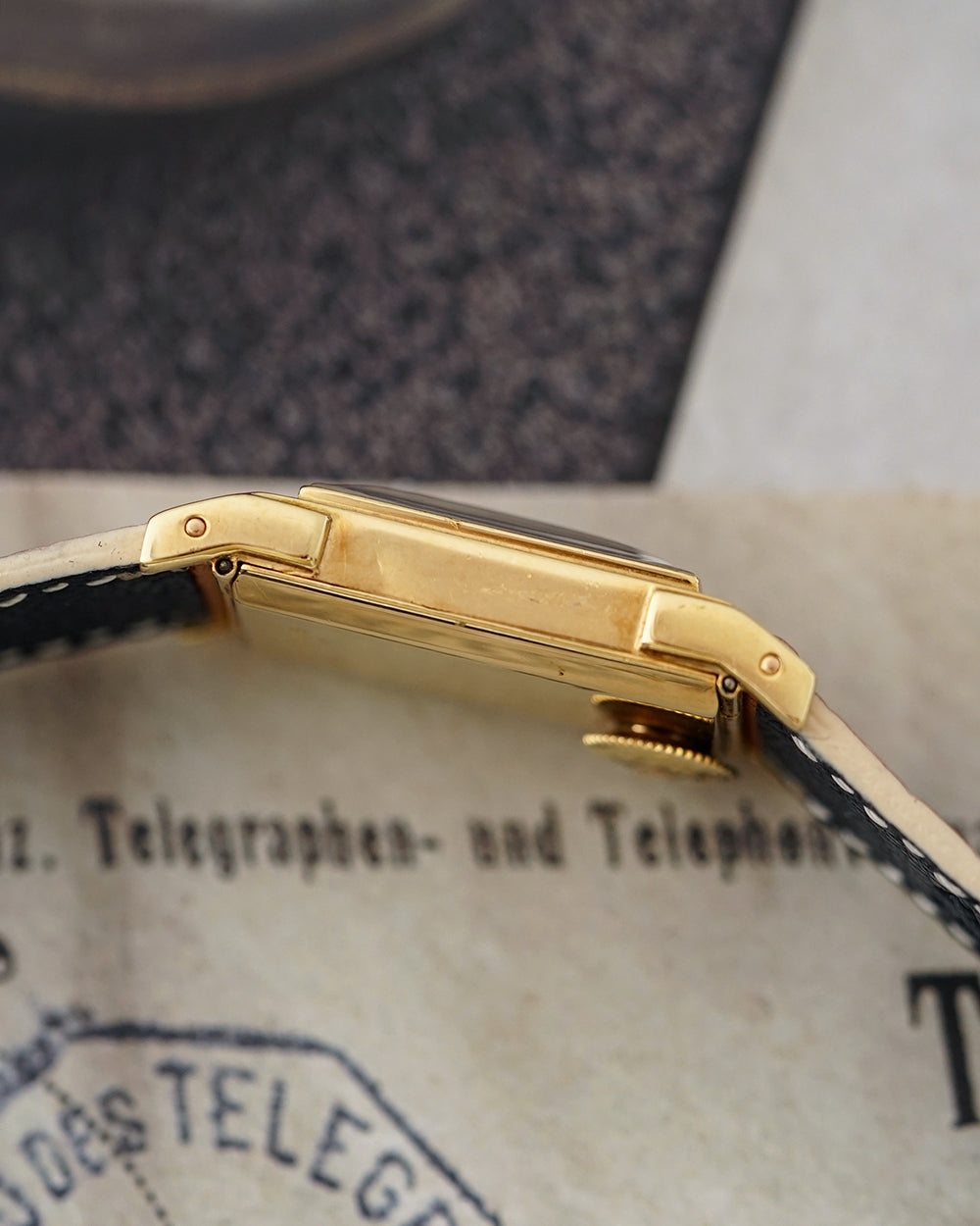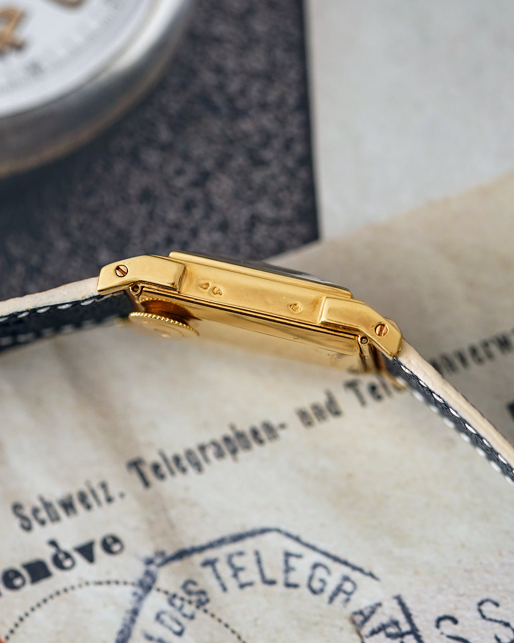 But beyond its historical significance, this watch is simply a style icon. A sophisticated alternative to the classic tank, it radiates understated luxury with its elegant 18k yellow-gold French case and sleek manual-wind movement. Adding to its charm, it comes fitted with its original solid-gold buckle, an exceptionally rare detail that beautifully complements an already exquisite piece. A perfect blend of innovation, rarity, and Paris-meets-Swiss refinement, made for the collector who appreciates both history and impeccable taste.