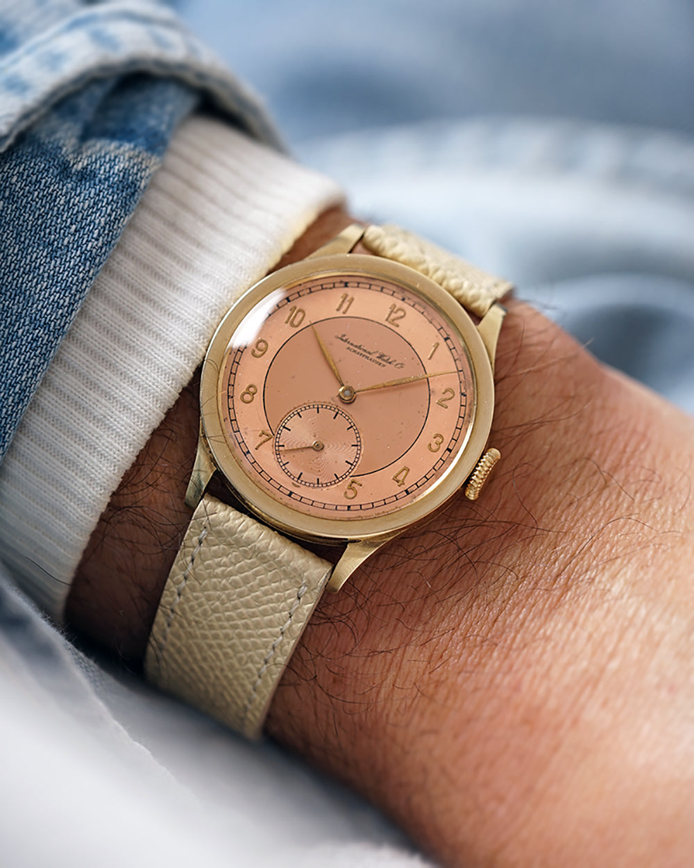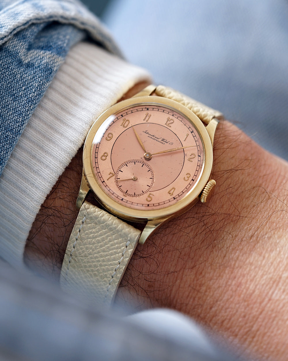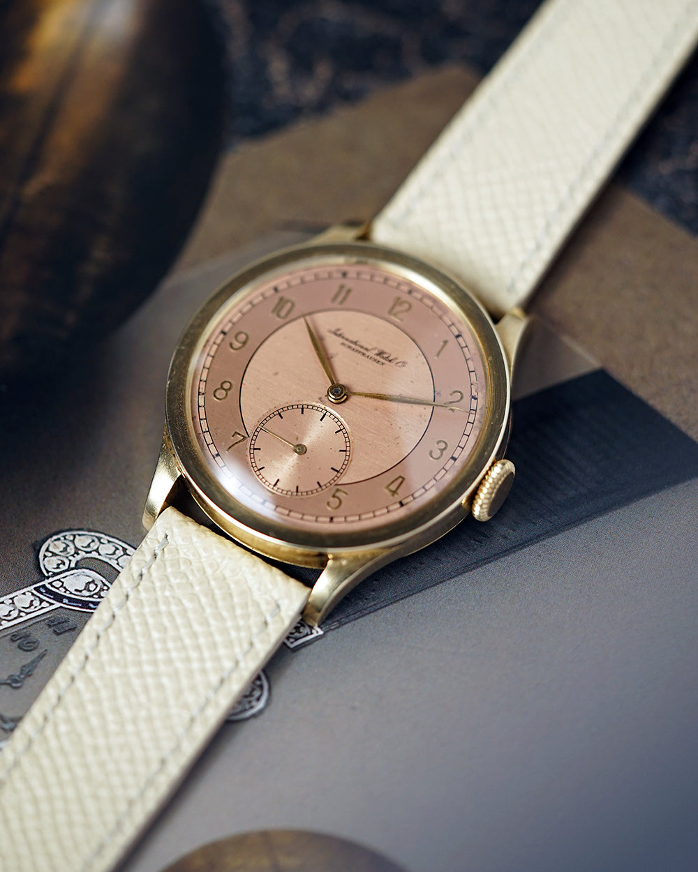 We’re genuinely thrilled to spotlight this 1939 International Watch Company gem, a watch that quite literally made us stop and stare. The two-tone salmon dial is the undeniable highlight, shifting character beautifully as the light moves across it. It has that rare chameleon quality you seldom see only on the most coveted (and costly) Patek 570s, and the design resemblance is unmistakable.