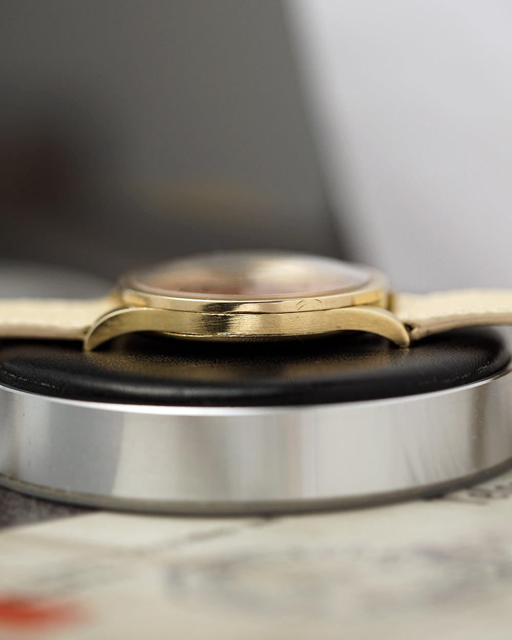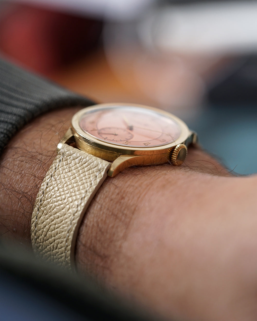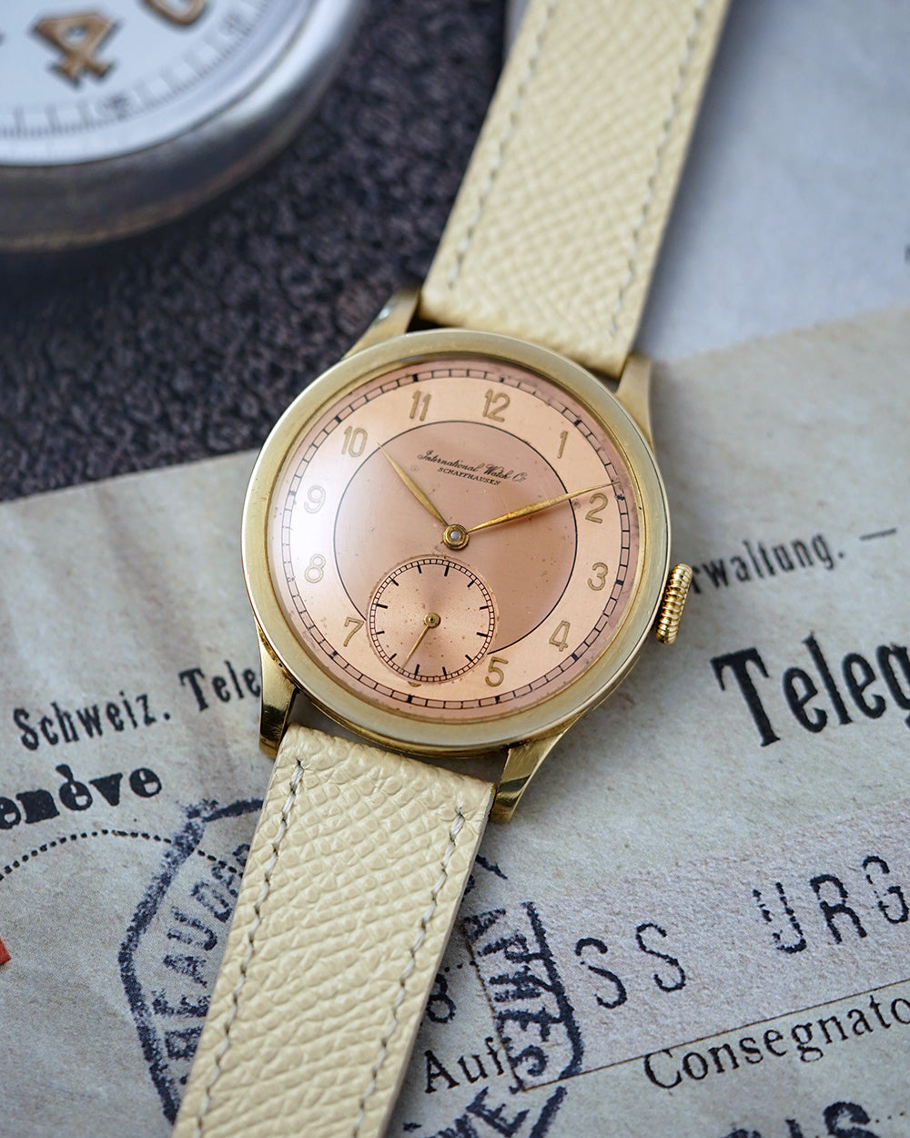 We’re genuinely thrilled to spotlight this 1939 International Watch Company gem, a watch that quite literally made us stop and stare. The two-tone salmon dial is the undeniable highlight, shifting character beautifully as the light moves across it. It has that rare chameleon quality you seldom see only on the most coveted (and costly) Patek 570s, and the design resemblance is unmistakable.