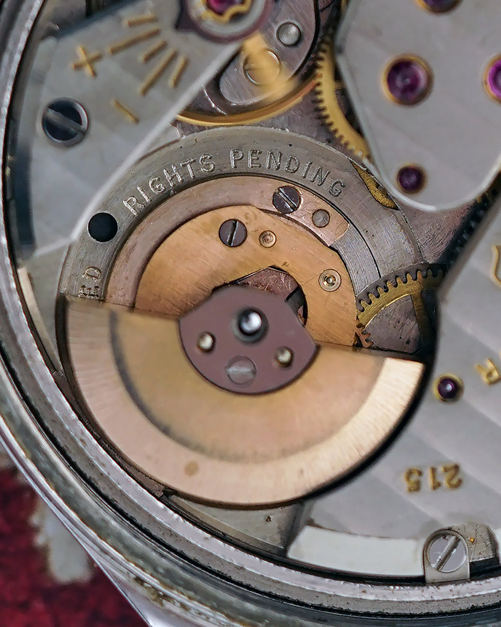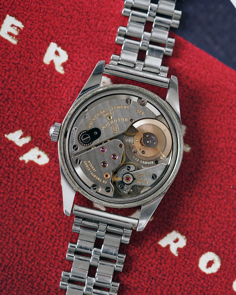 Some of these early examples, like this one, even feature the coveted “Patented Rights Pending” engraving beneath the rotor, a small but significant detail collectors chase today. The Caliber 215 wasn’t just a technical curiosity; it represented a genuine leap in watchmaking. By integrating a smaller, inset oscillating mass, Universal Genève created movements that were both slimmer and more refined, the kind of innovation that helped define mid-century horological design.